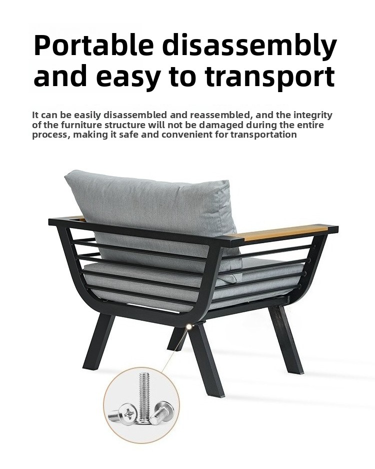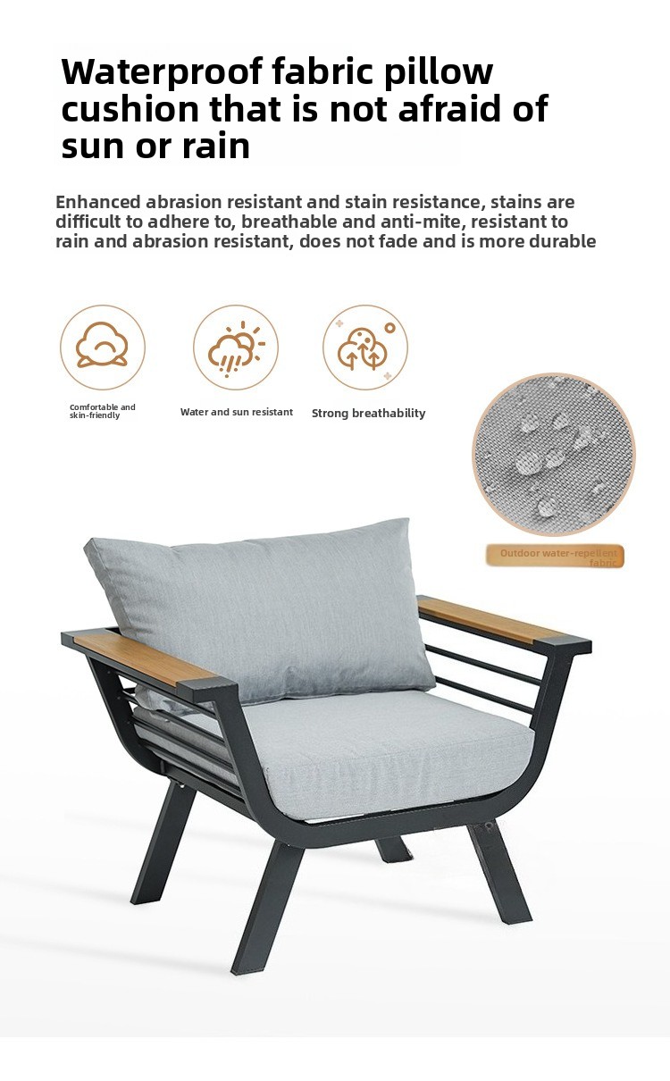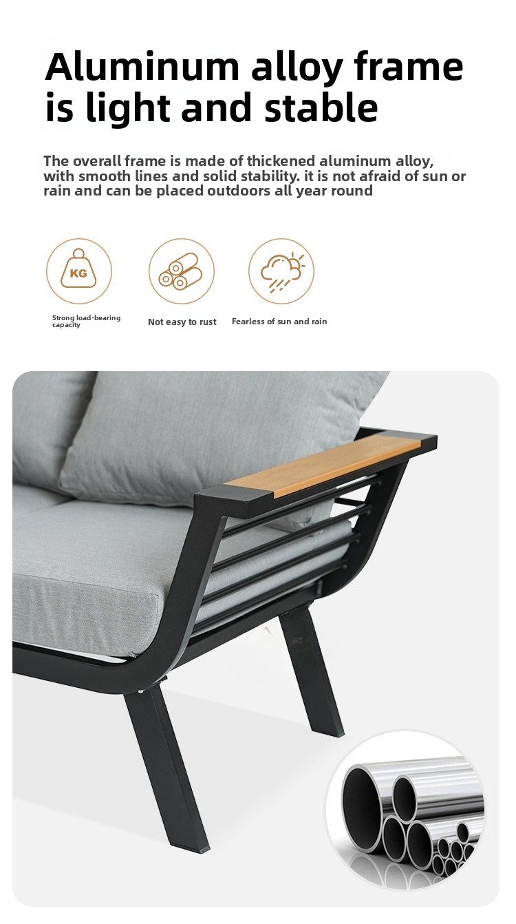 This product is designed for long-term outdoor use. It is waterproof, sunproof, and rust-resistant. It is also more environmentally friendly for indoor use, as no glue is used in its construction. In contrast, traditional fabric and leather sofas extensively use glue, with sponges wrapped around glued frames. This makes formaldehyde more difficult and time-consuming to volatilize and release. Our sofa is made of aluminum alloy and sponge, completely glue-free. Therefore, if you need an environmentally friendly sofa for your indoor living room, we are your better choice.