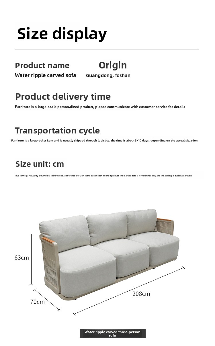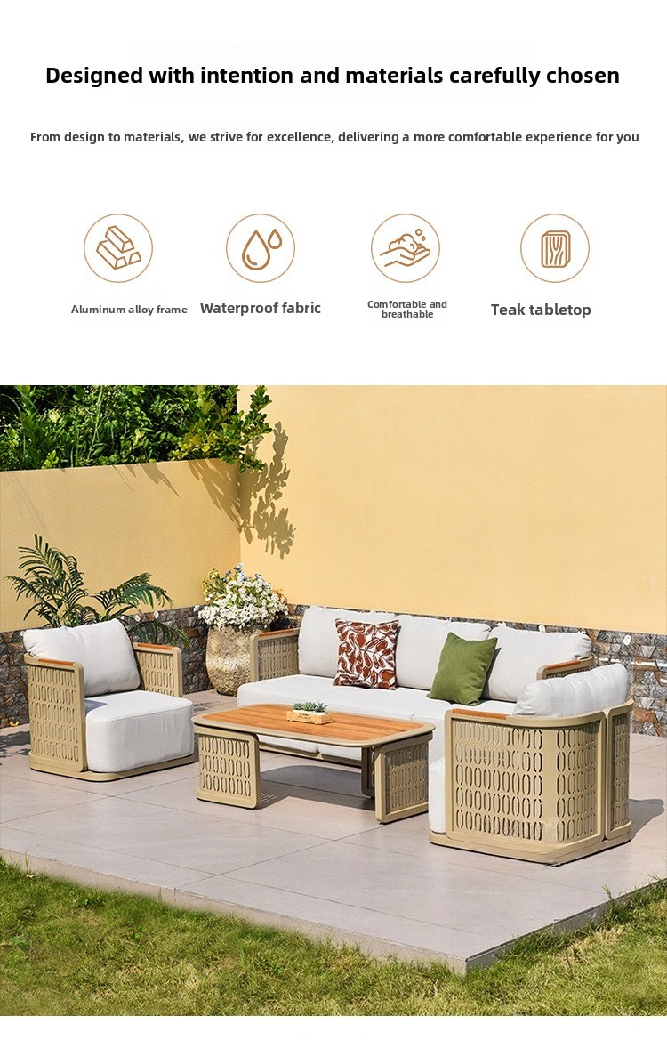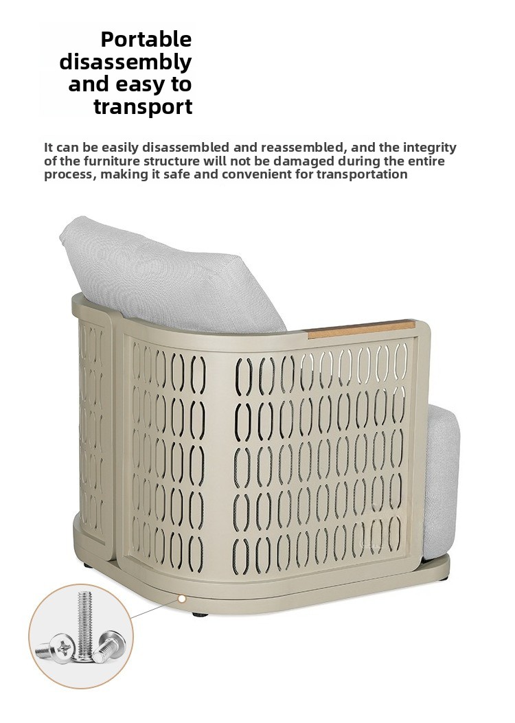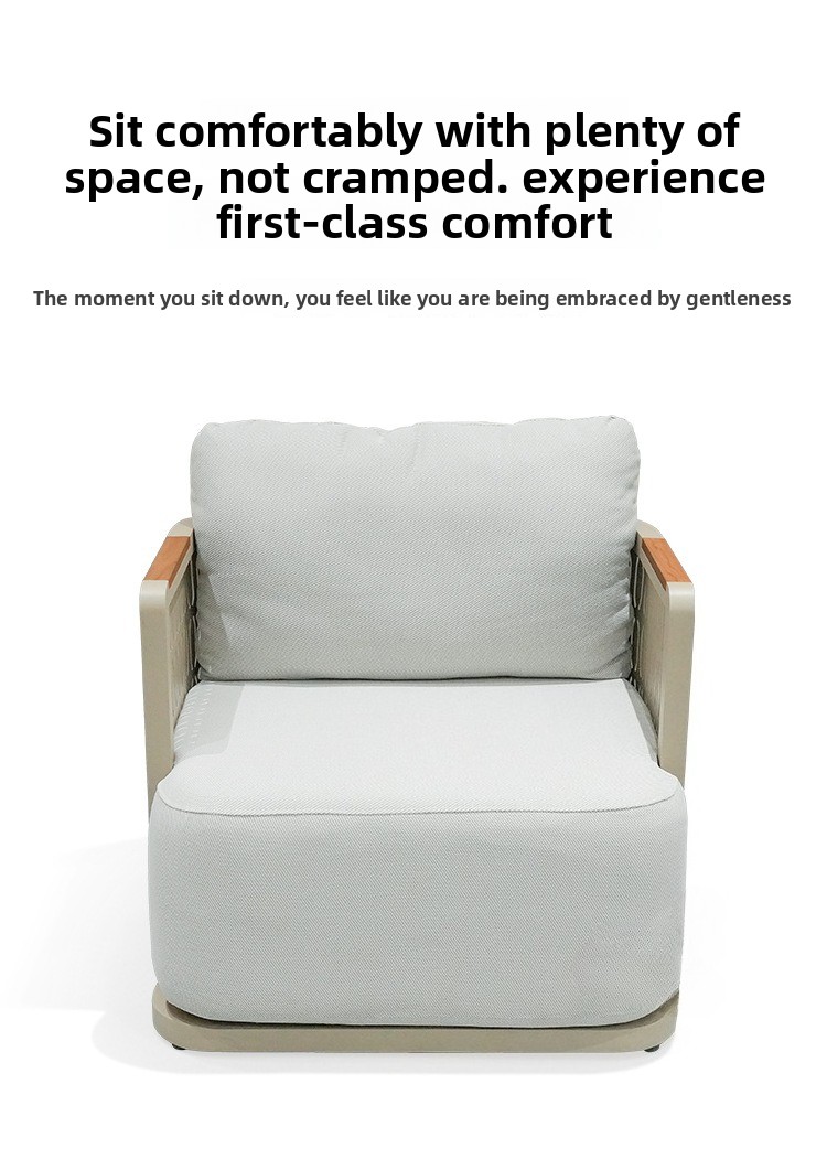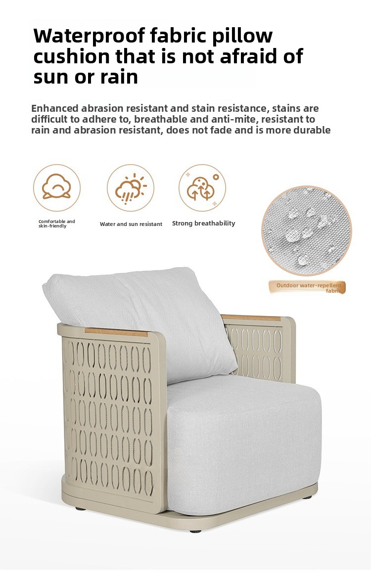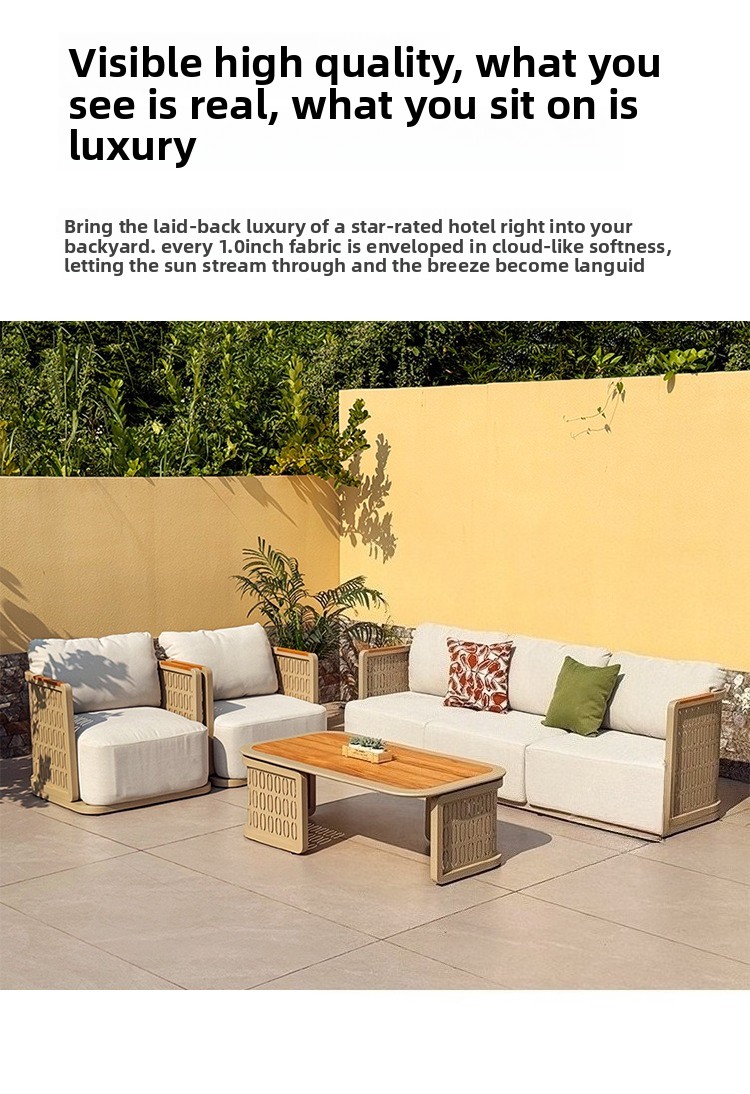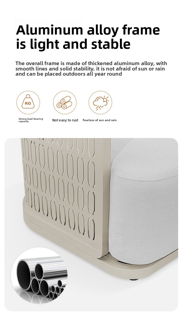 This product is designed for long-term outdoor use. It is waterproof, sunproof, and rust-resistant. It is also more environmentally friendly for indoor use, as no glue is used in its construction. In contrast, traditional fabric and leather sofas extensively use glue, with sponges wrapped around glued frames. This makes formaldehyde more difficult and time-consuming to volatilize and release. Our sofa is made of aluminum alloy and sponge, completely glue-free. Therefore, if you need an environmentally friendly sofa for your indoor living room, we are your better choice.